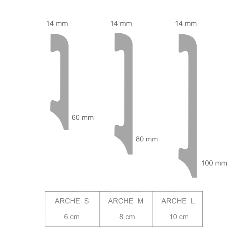Soklová lišta Arche dodá každému interiéru elegantný a decentný vzhľad. Mäkký obrys profilu zútulňuje priestor a vytvára prirodzený a plynulý prechod medzi stenou a podlahou. Dokonale sa hodí do klasického aj moderného interiéru a poskytuje štýlový vzhľad. Soklová lišta Arche je dostupná v troch veľkostiach.