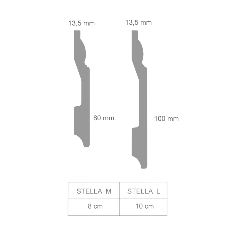 Táto decentná kolekcia soklových líšt kombinuje jednoduchý tvar s elegantným štvrťkruhovým tvarom na konci lišty. Tento dizajn si zachováva minimalistický charakter a zároveň dodáva jemnosť a vizuálnu ľahkosť. Rovné línie doplnené jemným zakrivením umožňujú soklovej lište bezproblémovo splynúť s priestorom a vytvárať tak ucelený a esteticky príjemný efekt. Soklová lišta Stella je dostupná v dvoch veľkostiach.